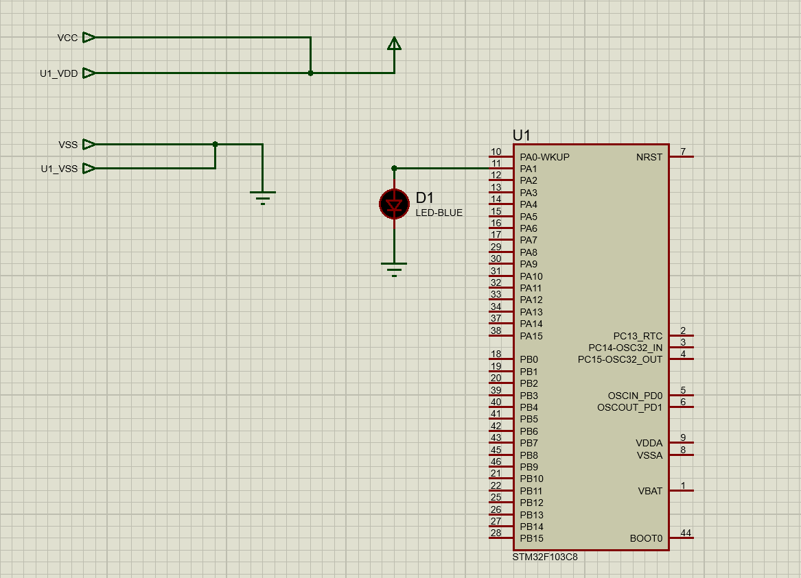 مدار ورودی (سمت Master): یک کلید فشاری (Push Button) همراه با یک مقاومت Pull-down (R1 با مقدار 1k) به پین ۴ متصل است. این آرایش تضمین میکند که در حالت عادی ورودی صفر منطقی (LOW) و در زمان فشردن کلید، یک منطقی (HIGH) باشد.