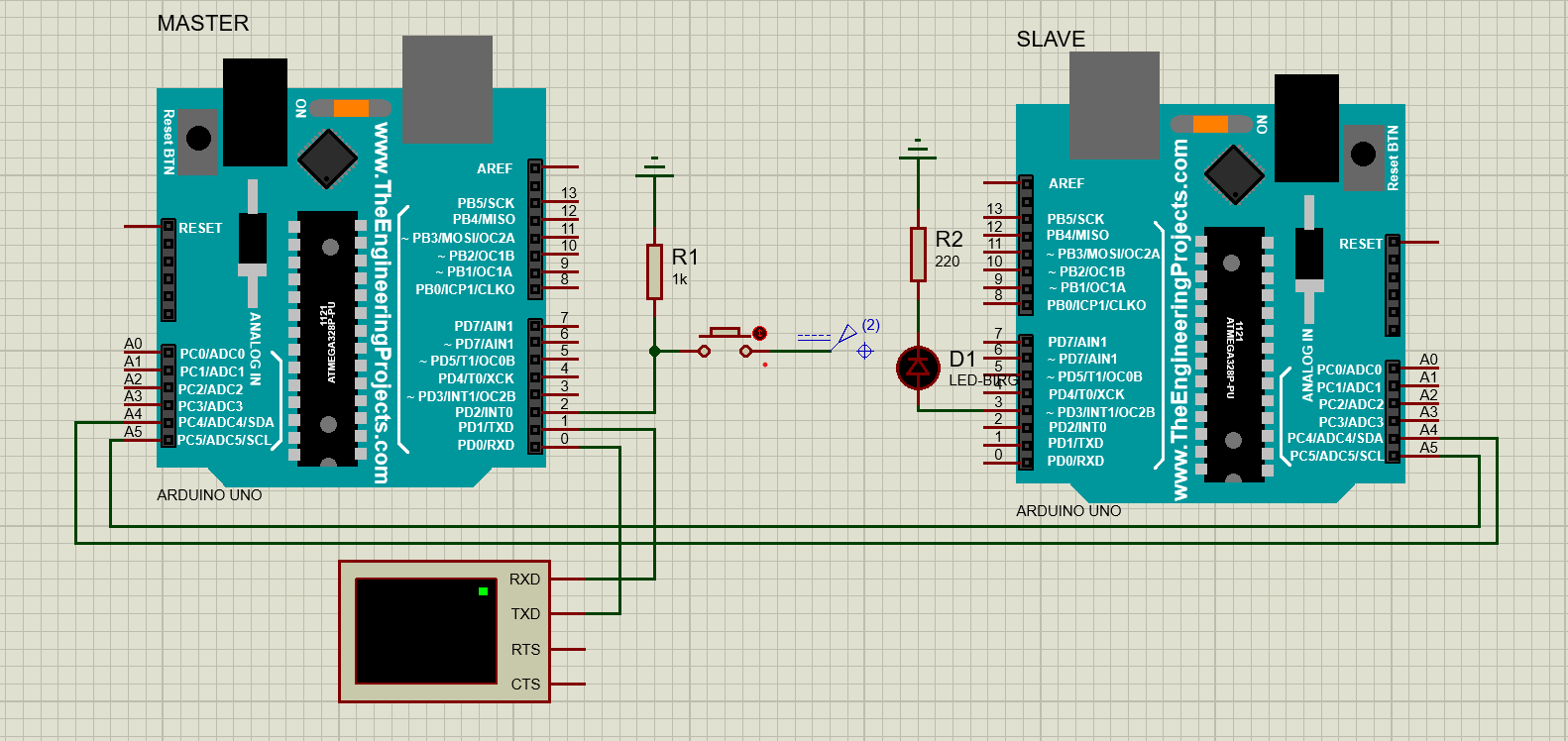 مدار خروجی (سمت Slave): یک LED قرمز رنگ با یک مقاومت محدودکننده جریان (R2 با مقدار 220 اهم) به پین ۴ متصل شده است تا با فرمان Master روشن شود.