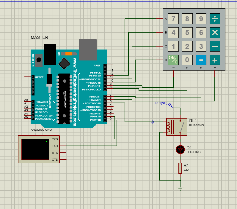 عملگر نهایی (Relay): اگر رمز صحیح باشد، آردوینو پین متصل به رله را تحریک میکند. رله (که یک کلید الکترومغناطیسی است) تغییر وضعیت داده و مدار لامپ (LED) را وصل میکند. استفاده از رله نشان میدهد که این مدار قابلیت کنترل وسایل برقی واقعی (مانند قفل برقی درب یا موتور) را دارد.