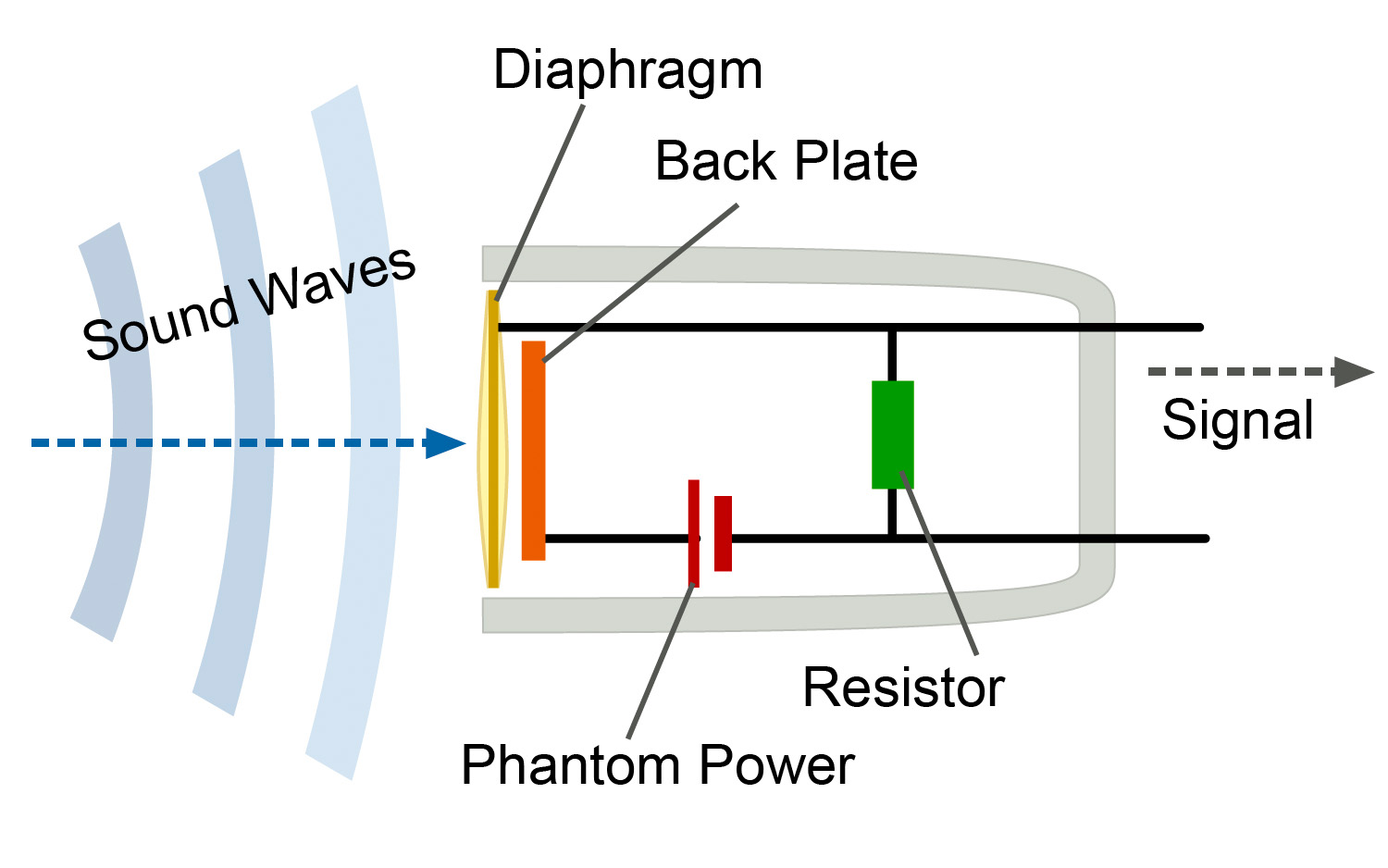 به این ترتیب، میکروفون خازنی با تبدیل نوسان مکانیکی دیافراگم به تغییرات ظرفیت و سپس تغییرات ولتاژ، یک سیگنال الکتریکی آنالوگ تولید میکند که شکل آن کاملاً با موج صوت ورودی یکسان است.