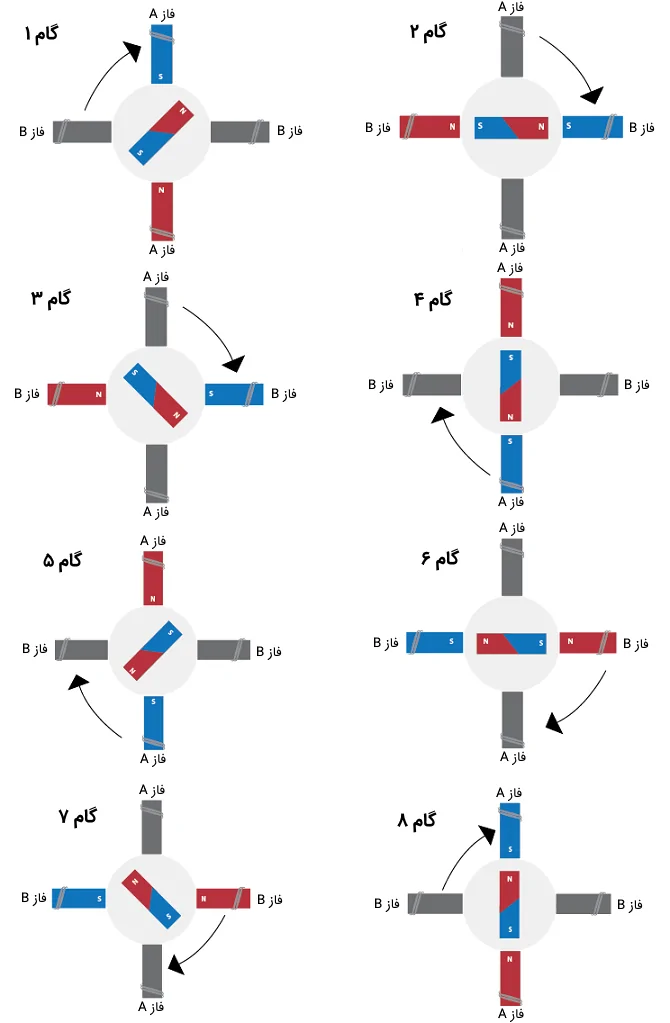 دوباره فازهای B و A (بعدی) با هم فعالاند. روتور بین محورهای B و A بعدی قرار میگیرد و نیمپلهی بعدی را طی میکند.