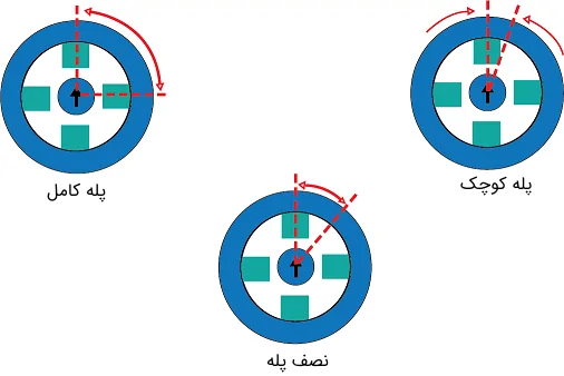 با کنترل زاویه هر پله، میتوانیم دقت و نرمی چرخش روتورِ موتور را کنترل کنیم. در موتور پلهای، سه مُد یا حالت تحریک وجود دارد که در شکل زیر نشان داده شدهاند.