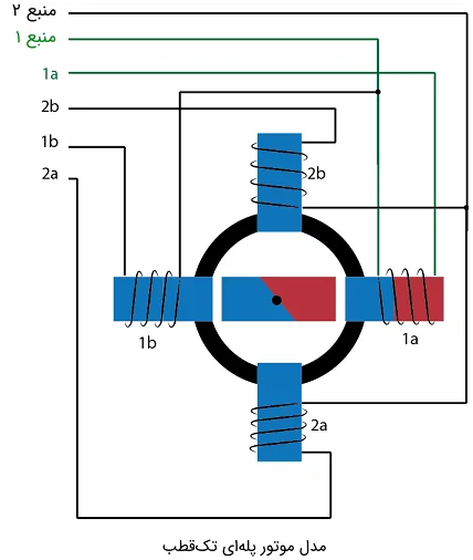 به عبارت دیگر، در موتور پلهای تکقطبی دو سیمپیچی برای هر فاز وجود دارد. دو سیمپیچی هر قطب ممکن است سیمهای مشترکی داشته باشند و از میان آنها انشعاب گرفته شود. موتور تکقطبی عملکرد سادهای دارد، زیرا در آن نیازی به معکوس کردن جریان با یک مدار درایور خارجی نیست. شکل زیر، سیمبندی این نوع موتور را نشان میدهد. به دلیل وجود سیم اضافه در میانه سیمپیچها، موتور پلهای تکقطبی نصف مقدار شار مغناطیسی خود را برای شارش جریان کاهش یافته تولید میکند. بنابراین، موتور پلهای دوقطبی گشتاور بیشتری نسبت به یک موتور پلهای تکقطبی تولید میکند.