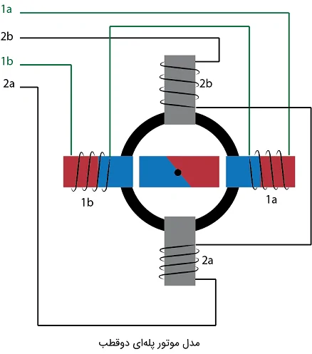 موتور دو قطبی دارای سیمپیچهای کامل بدون مرکز تقسیم است و جهت جریان باید برای تغییر قطبها معکوس شود. این طراحی باعث میشود روتور بتواند از تمام طول سیمپیچ برای تولید میدان مغناطیسی استفاده کند و حرکتهای پلهای دقیق و پرقدرت تولید شود.
